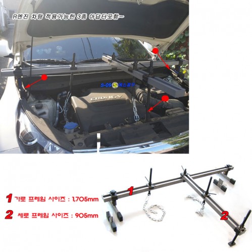 - 구성 : 엔진고정서포터(3종 * 5개) + 프레임 + 후크 2pcs + 체인 2pcs 받침지그(길이 365mm * 2개, 200mm * 2개) 라디에터그릴고정용 * 1개 - 고강도 후크(자동), 체인, 견고한 서포트사용 - 국산 신형 고강도후크(자동), 체인, 견고한 프레임사용 | |